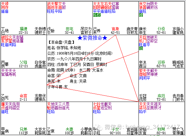 “文革”爆发后,张学铭遭受迫害,1968戊申年被关押入狱,因大运癸亥,干支皆水,且大运冲月支。口诀曰:“金神运入水乡,身衰夭折。”好在申、巳、酉合金局,日元不弱,且寅亥合木,暗有生火之意,受苦而已,不至于死。1973年平反后,张学铭出任全国政协委员、天津市政协常委,显然因为甲子大运伤官生财。