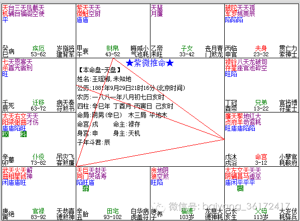 “光绪七年八月初七日亥时。王瑶卿命:身旺用财而见丁制辛,专用己土伤官,丙寅红艳桃花,伤官合起桃花,为一代名伶。”
