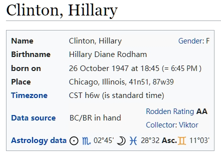 希拉里·黛安·罗德姆·克林顿Hillary Diane Rodham Clinton),1947年10月26日出生于伊利诺伊州芝加哥,时辰有疑问: